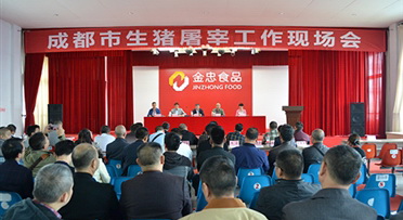 2016年10月9日,成都市生豬屠宰工作會議在金忠食品大禮堂舉行,成都市農業綜合執法總隊隊長蔣德陽,成都市農業綜合執法總隊副總隊長張樹成,成都市綜合執法總隊支隊長李再華,市肉類協會黃萍秘書長,市肉類協會會長、四川金忠食品股份有限公司董事長劉俊嶺,成都市屠宰行業各位企業負責人參加此次會議。